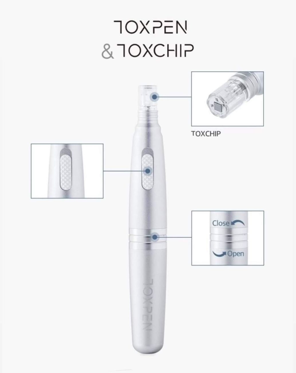 Přístroj TOX PEN je unikátní systém s výměnnými nástavci, díky kterému můžete bezpečně zapracovat látku hlouběji do pokožky díky speciálnímu nano čipu se silikonovými mikrojehličkami o hloubce 0.15 mm.